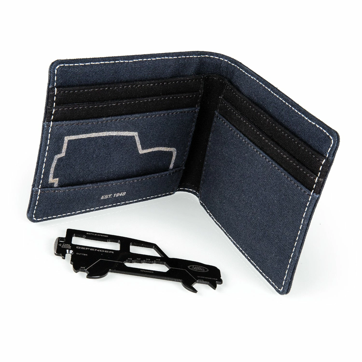 Die Brieftasche aus Stoff enthält sechs Kartenfächer und ein Fach für das Land Rover Defender Multitool.