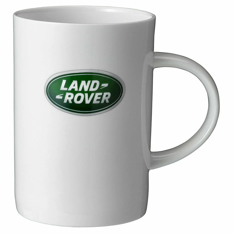 Diese Tasse präsentiert sich in schlichter, weißer Klarheit mit dem Land Rover Logo in der Mitte.
